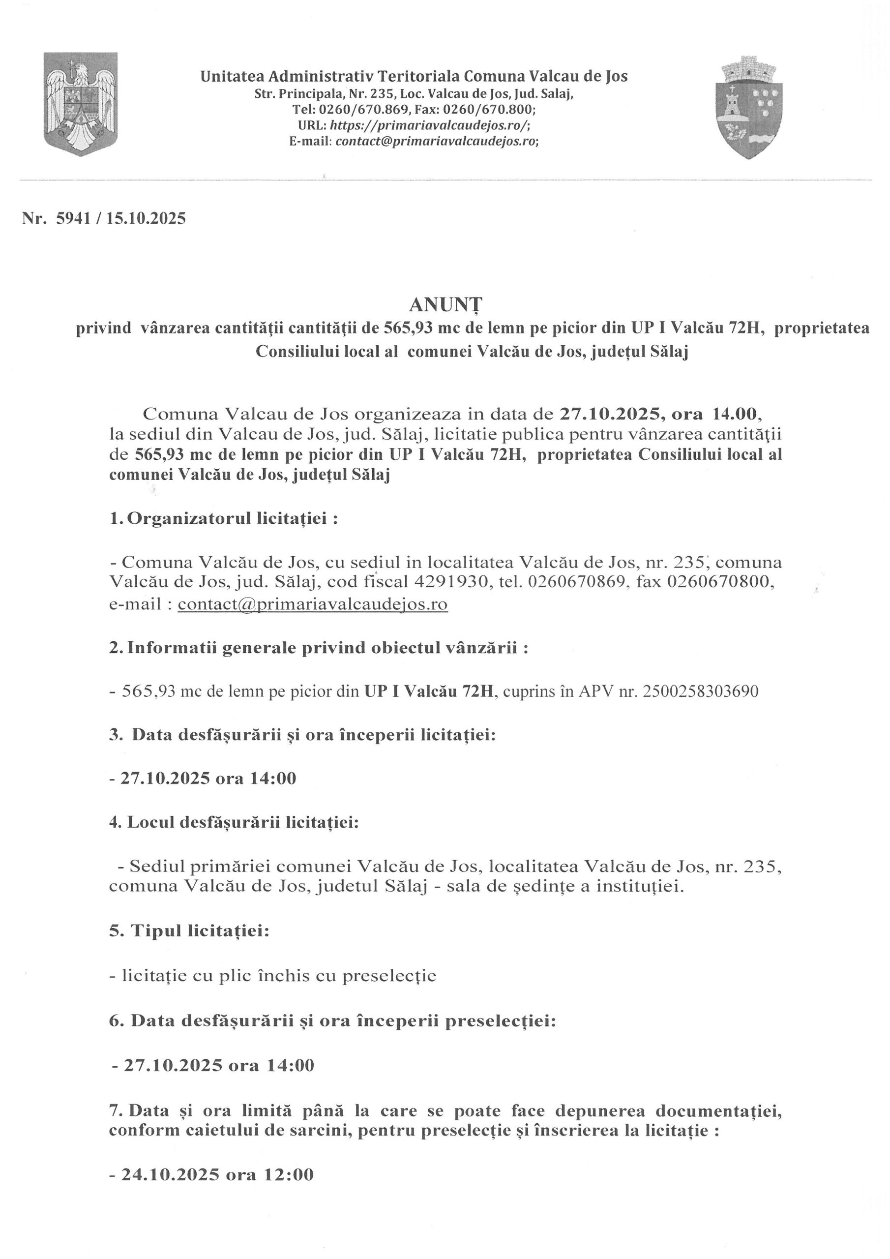 Anunț privind vânzarea prin licitație a cantității de 565,93 mc de lemn de picior din UP I Valcău 72H