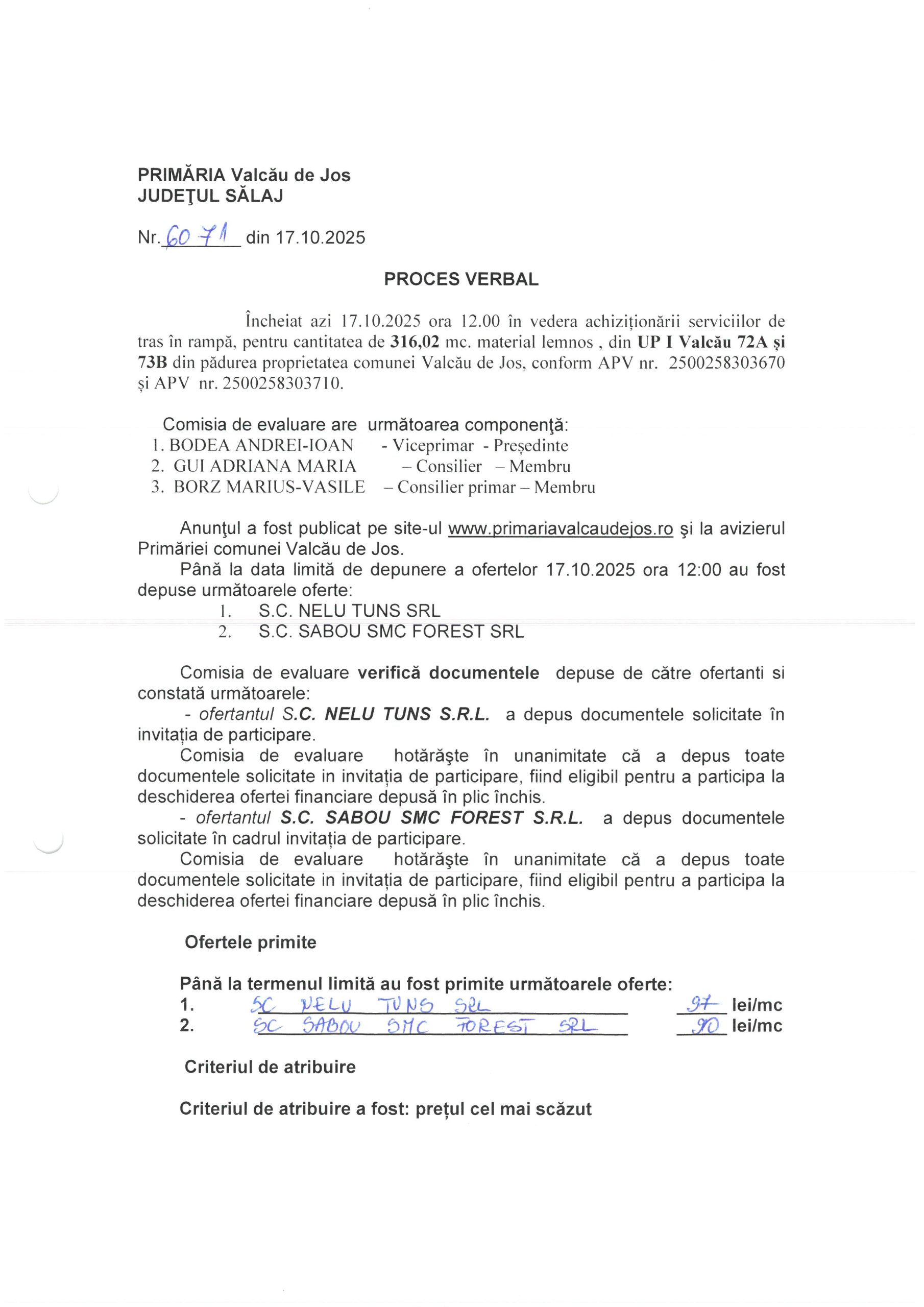 Proces verbal de evaluare oferte servicii de tras în rampă – 316,02 mc material lemnos destinat vânzării către populație