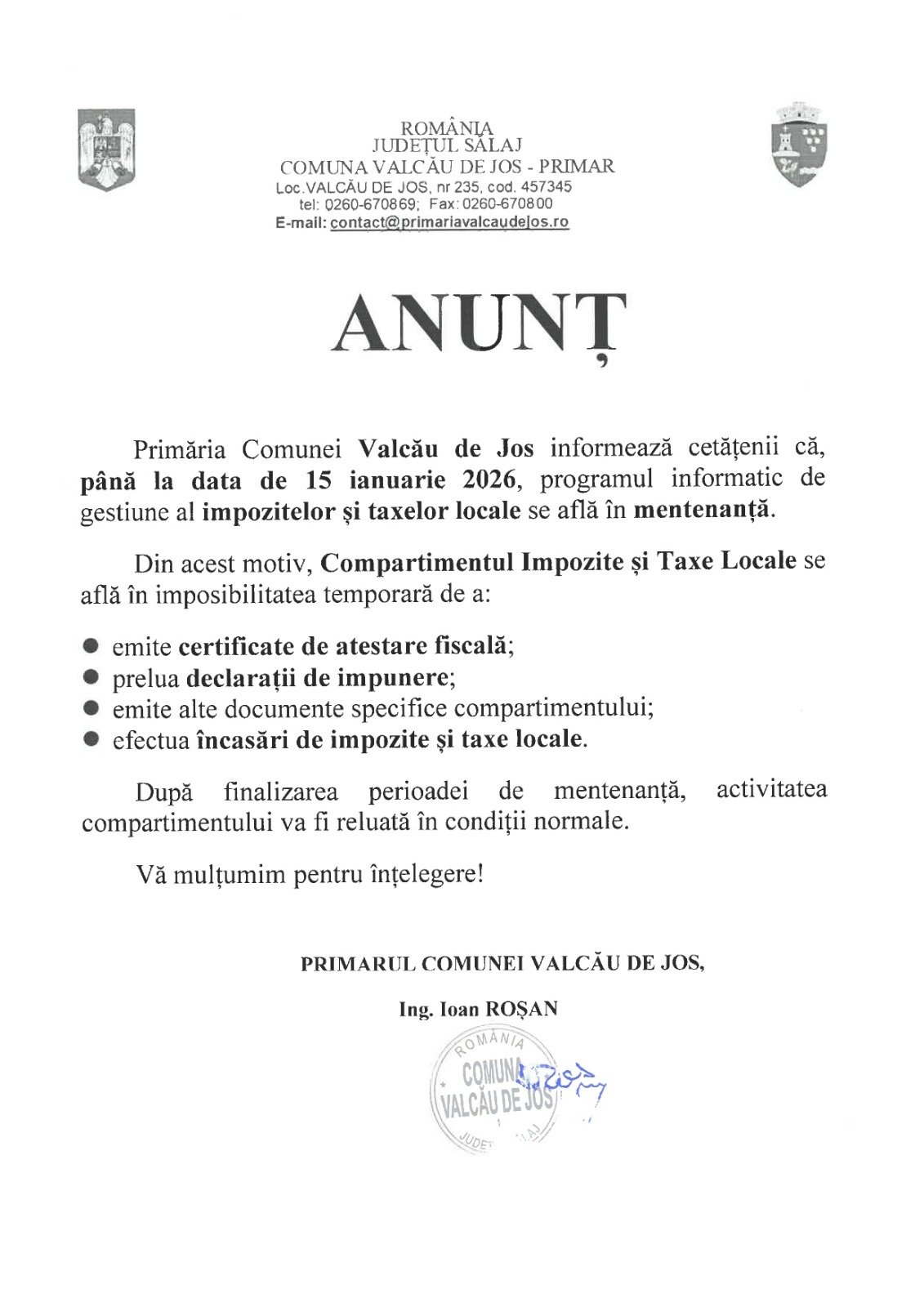 Anunt- mentenanta Compartimentul de Impozite si Taxe Locale
